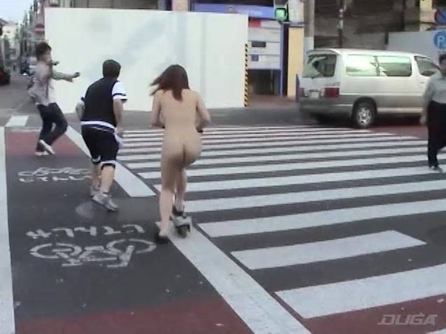 下着姿でキックボード、最初は下着姿だが脱ぐように言われて全裸に。全裸のまま横を車の通る横断歩道や商店街を疾走!